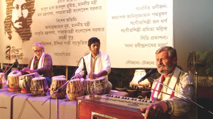 The organisers honoured Professor Emeritus Anisuzzaman, US-based Tagore researcher John Thorpe and legendary Tagore artiste Pramita Mallick [of India] at the event. Launching of recitation album “Nana Rabindranath-er Mala”, recorded by Rupa Chakraborty, Shahria Pew and Bulbul Mahalanabish followed. Apart from solo and group recitations presentation by the noted artistes of the country, the cultural part of the event solo songs performance by Laisa Ahmed Lisa, Mohiuzzaman Chowdhury, Pramita Mallick, Fahim Hossain Chowdhury, Lily Islam, Anup Bhattacharya and others, while Geeto Shatodol artistes rendered choral songs.