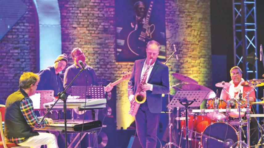 Jakob Dinesen is considered one of the best musicians to have come out of Denmark in recent years, and on his debut on the Dhaka stage, he took the audience on an emotional journey with his tenor saxophone, from excitement to melancholia to the sincerest forms of love. There is a certain smoothness to the timbre of a saxophone's sound, and in the hands of a skilled musician like Dinesen, it felt strangely comforting, despite being a rather unfamiliar sound. In particular, two pieces – one which he had written when his wife was expecting a baby, and another written for his wife, Yasmin – drew a big applause. But then came the surprise: the Danish ambassador to Dhaka, Mikael Hemniti Winther took the stage rather innocuously, thanking the organisers for inviting Jakob to the festival, before strapping on a vintage Gibson sunburst guitar and launching into the Eric Clapton/Robert Cray hit “Old Love”. His immaculate skills on the guitar immediately showed that he's no amateur, and as his baritone vocals was a treat to the ears. He played along to a few other numbers, the last of which was a blues song from Thailand, sung by the Thai drummer.
