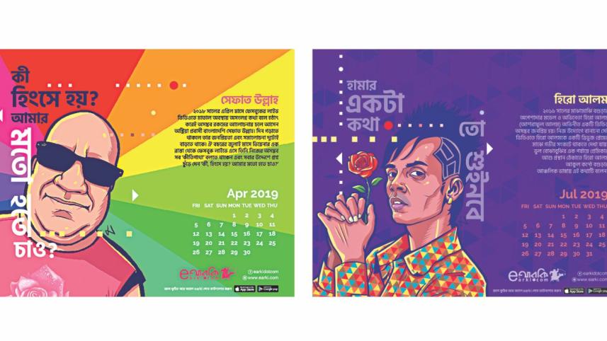Team Earki is inspired by Know Your Meme, a website that documents internet memes and viral phenomena. In recent years, various individuals in Bangladesh have become the talk of the town, owing to their amusing stories, opinions and characteristics, both online and offline. While this lot of viral sensations includes prominent politicians, models and journalists, it also has ordinary citizens, who have found a place in our everyday conversations, social media statuses, comments and internet memes. The calendar provides brief histories of the different memes used for the twelve months. Under the tagline, Rongobhora Bongodesh, it features Sefat Ullah's “Ki, Hingshe Hoi? Amar Moto Hoto Chao?”, Abdul Hai's “Naam Bolle Chakri Thakbe Na,” Shamim Osman's “Khela Hobe!” and several others.