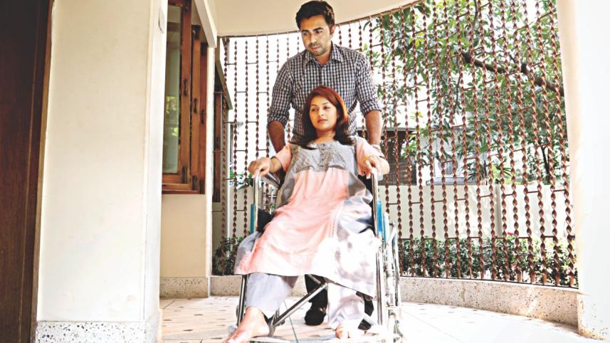 Stepping into the shooting house, I was held aback at the site of an ailing Monalisa on a wheel chair. As she looked unusually frail, I could not help but enquire the director, Ashfaque Nipun, about her appearance. He immediately comforted me saying that it was a requirement for her role in the tele-fiction titled Hoyto Tomar Kachhei Jabo, where the renowned model stars alongside famed actor Apurba.