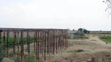 Construction of a connecting bridge on a canal in Char Kurulia area under Ishwardi upazila in Pabna has remained incomplete for three years.