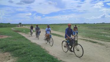 A vast sunflower field, stretching across three acres, bathed in a sea of yellow hues. From a distance, it looks like a million tiny suns dancing in the wind. Ponds and green fields on both sides only add to the field’s intrigue, which is situated in Pabna Sadar’s Tebunia area.