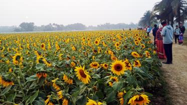 Nestled amid ponds and green fields, Bangladesh Agriculture Development Corporation's seed production farm in Pabna Sadar's Tebunia area has become an unexpected tourist attraction, thanks to its expansive three-acre sunflower field in full bloom