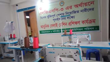 Sitting in front of an electric sewing machine inside the Swanirvar Dhamsona Union Parishad (UP) building in Savar, Rozina was trying to stitch two pieces of cloths together.