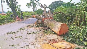 Forest Department is felling some 1,221 fully-grown trees in the name of widening two roads in Dhaka’s Dhamrai, although any road expansion project is yet to be taken.