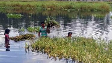 Almost ripe paddy on 200 hectares of land on the bed of the nearly dead Sati river in Kaunia upazila of Rangpur has become flooded,