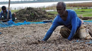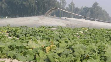 Farmers of Kashimpur village in Birganj upazila of Dinajpur formed a human chain on the dried up bed of the Atrai river yesterday demanding that the authorities postpone leaving the dredged mud there till harvest of the crops cultivated there.