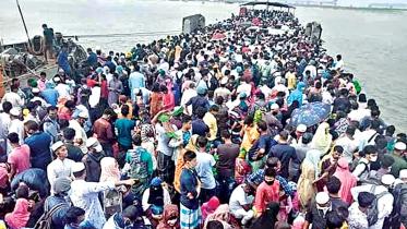 Hundreds of people are stuck at the Shimulia-Kathalbari and Paturia-Daulatdia ferry terminals on their way to village homes, as the authorities suspended the ferry services to prevent crowding -- in an attempt to curb coronavirus transmission.