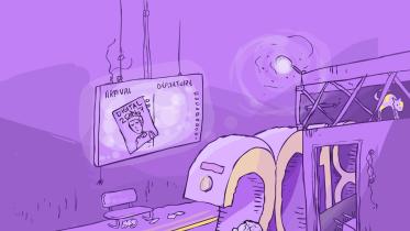 Propping up a hood against a mild December chill, a lone figure strides forward along the train platform.