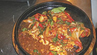 In a wok on medium heat add vegetable oil, follow by garlic and bird's eye chillies; fry for 2 minutes, add nam-prik-pao (Thai roasted chilli paste) stir-fry until an aroma comes off. Add sea food and stir-fry until half cooked.Add white