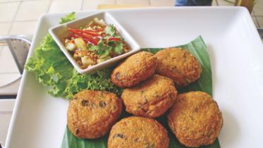 Mix fish, egg, and cold water in a food processor and blend them together until the mixture turns sticky. Put the fish mix in a mixing bowl. Add curry paste, kaffir lime leaves, long beans, sugar, and salt to the mixing bowl and mix all ingredients together into sticky dough. Heat oil in a wok on high heat. Turn to low heat when the oil reaches frying temperature.
