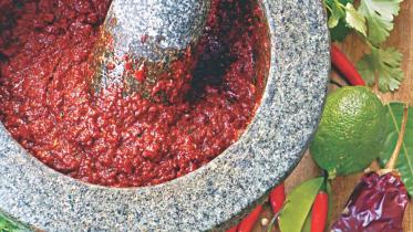 Crush the chillies and garlic in a mortar into a fine mix. Cook noodles in boiling water for 20 seconds. Use a strainer to take it out and transfer to a mixing bowl. Cook shrimps in the same boiling water.