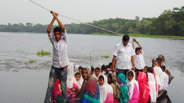 Locals including a good number of students have to cross Boalia canal between Ratneshwar and Panpatti villages in Patuakhali’s Galachipa upazila amid risk on a small country boat locally known as ‘kheya’.