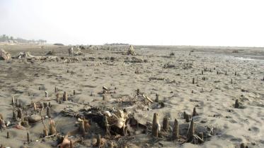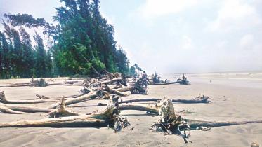 A number of trunks of dead trees have surfaced in a portion of Kuakata sea beach, causing disturbance to free movement of visitors in
