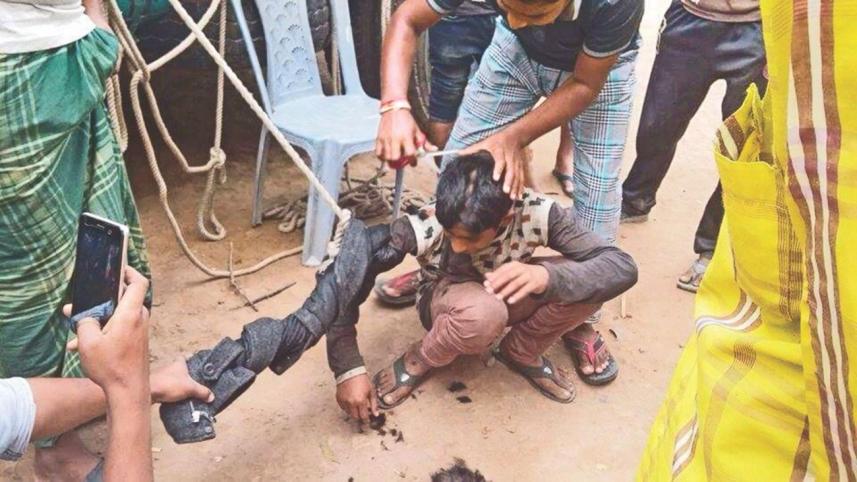 Despite voicing his innocence, Nazmul Haque of Baroipara village was beaten, tufts of his hair cut and face smeared in burned engine oil, all the while tied to a truck, said police and witnesses.