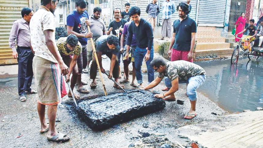 Fed up with the authorities' failure to solve the prolonged waterlogging problem at Haji Khorshed Ali Sardar Sarak in the capital's East Jurain, locals have taken matters into their own hands.