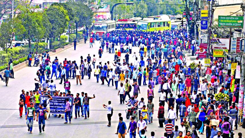 part of Mirpur Road in front of their Shyamoli campus yesterday. The demonstration obstructed traffic in the area for about two hours.