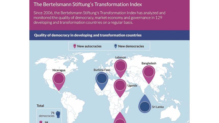 Bangladesh is among five countries that no longer meet minimum standards for democracy and are now under autocratic rule, German-based think-tank Bertelsmann Stiftung said in a report published yesterday.
