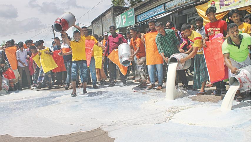 Like them several hundred dairy farmers, finding no other way, dumped their milk at the Bhangura Poura bus stand area yesterday noon and staged an hour-long demonstration protesting the sudden closing of milk collection from the farmers.
