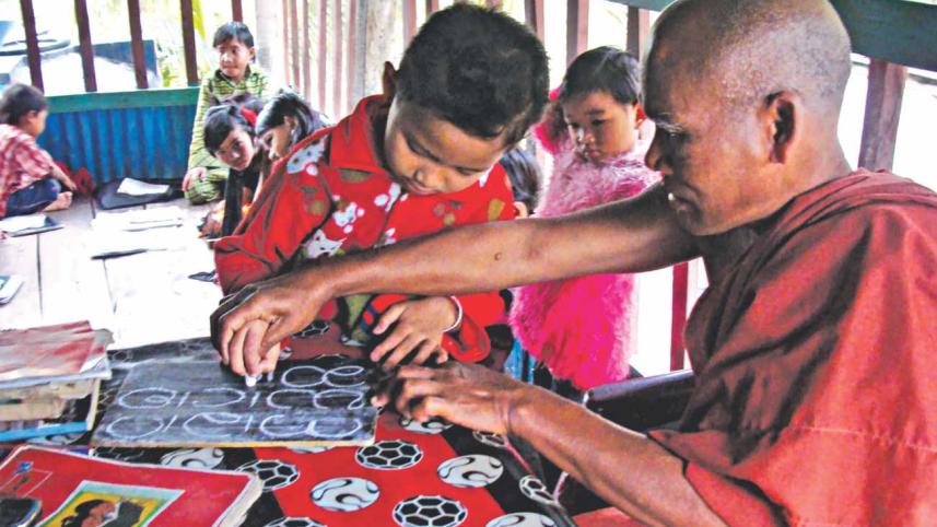The importance of one's mother tongue is perhaps nowhere better understood than in Bangladesh. A mother tongue is an indispensible fundament of self-identity. Armed with such understanding, Buddhist monk Utuchitta Mohathero from Amkholapara temple in Patuakhali's Kuakata is making efforts to ensure the next generation of his Rakhine community do not lose touch with the Rakhine language.