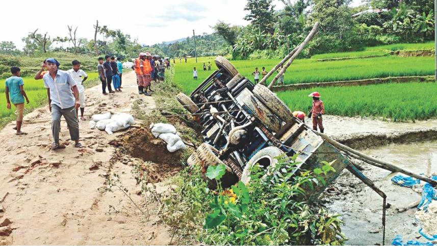 One of their trucks was able to cross a patch of battered road near Chakdhala BGB camp area but the second truck flipped over.