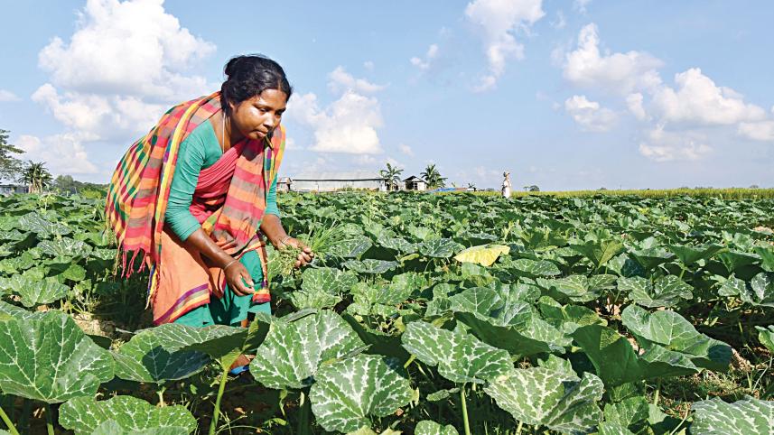 Olivia's family has already harvested the bitter gourd and sold it twice for Tk 10,000, and their pumpkin field looks set to give a good harvest -- she is hopeful of selling the pumpkins for over Tk 13,000. Their one acre of Aman paddy has already ripened and is ready to be harvested.