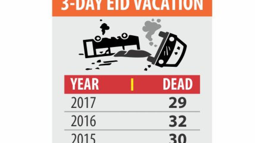 During the three-day holidays of last Eid-ul-Azha, road accidents had taken 32 lives. This year the number has been 29 while it was 30 in 2015, 26 in 2014, 10 in 2013 and 40 in 2012.