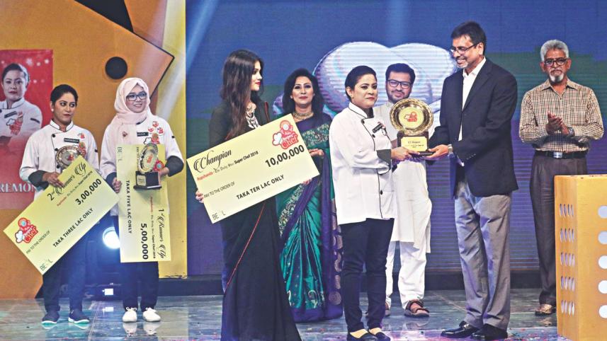 After much anticipation and peaking excitement, the big night of the fifth season of Rupchanda-The Daily Star Super Chef, jointly organized by Bangladesh Edible Oil Limited and The Daily Star, had finally arrived yesterday. The suspense has been lifted to announce the winner of the grandest cooking competition of Bangladesh. Shamsun Nahar, hailing from Rajshahi, won the most desired Super Chef title defeating her two other contenders.
