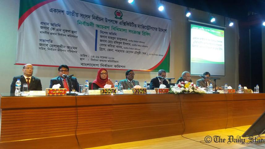 Chief Election Commissioner (CEC) KM Nurul Huda and the four election commissioners were briefing the executive magistrates of Sylhet, Barishal and Chattogram about electoral code of conduct at the EC Office in the morning.