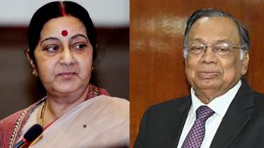 Indian External Affairs Minister Sushma Swaraj congratulates Bangladesh Foreign Minister Abul Hassan Mahmood Ali on his victory in the 11th National Parliament Election.