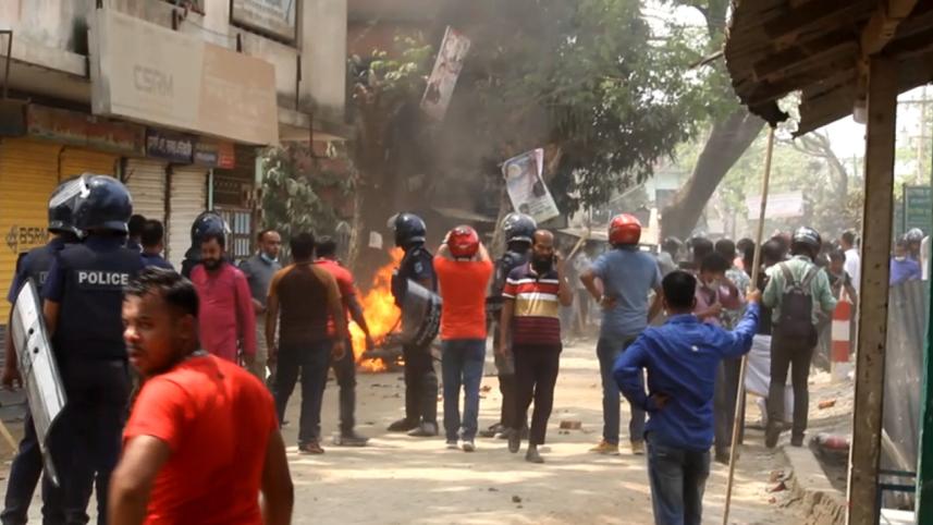 Hefajat activists threw brick chips on the law enforcers. Several shops were damaged and three motorcycles were torched during the clash, added witnesses.