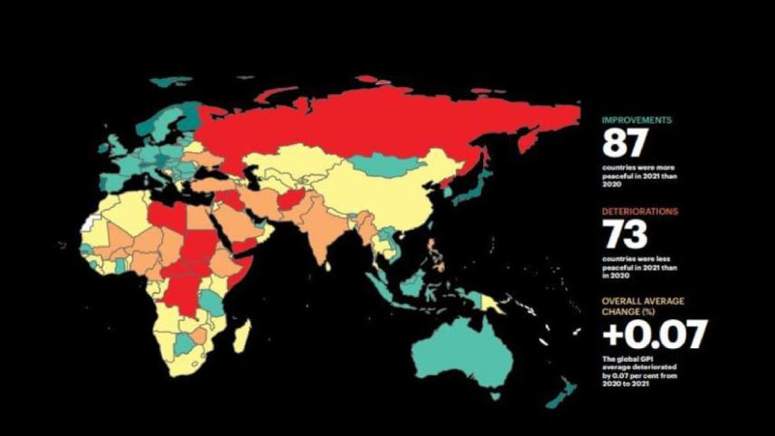 Bangladesh has climbed up 7 notches from last year and secured 91st position -- among 163 countries -- in Global Peace Index for 2021.