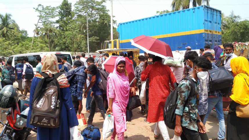Crowds are forming at Paturia ferry ghat and Aricha from Daulatdia of Rajbari district as holidaymakers started to return to Dhaka after celebrating Eid-ul-Fitr at their village homes.