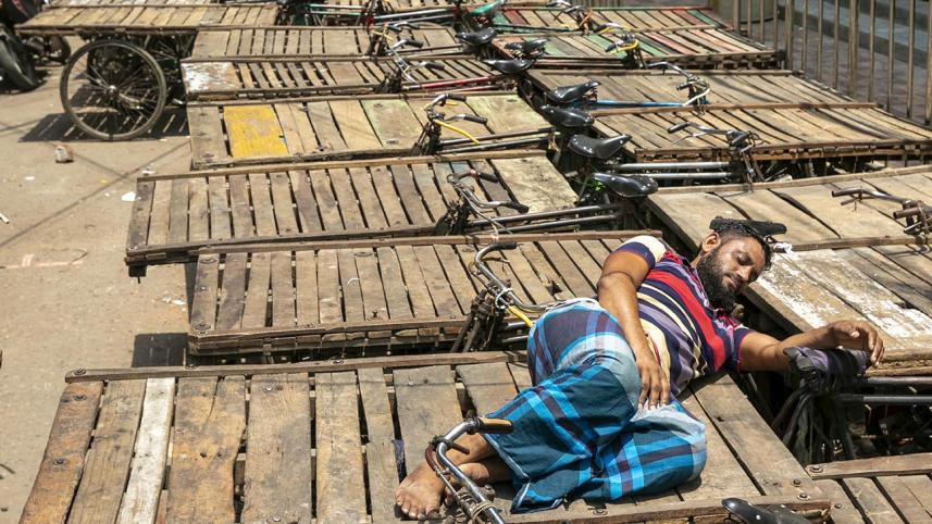 A rickshaw van puller sleeps on his van in front of Nupur Market on Rail Station Road in Chattogram city on April 15, 2021. Photo: Rajib Raihan