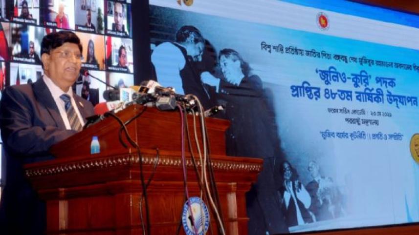 Foreign Minister Dr AK Abdul Momen said this while addressing a discussion at Foreign Service Academy, marking the 48th anniversary of Bangabandhu's Joliot Curie Peace Prize given in recognition of his contributions to world peace.