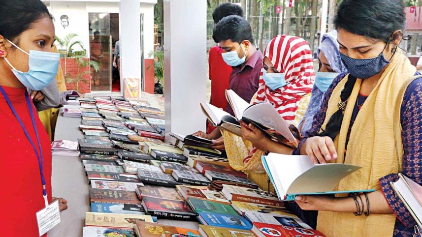 Visitors browse books at a stall of Amar Ekushey Boi Mela at Suhrawardy Udyan in the capital yesterday. Earlier in the day, Prime Minister Sheikh Hasina inaugurated the event virtually from the Gono Bhaban. The fair, traditionally organised in the month of February, was postponed this year due to the pandemic. Photo: Prabir Das