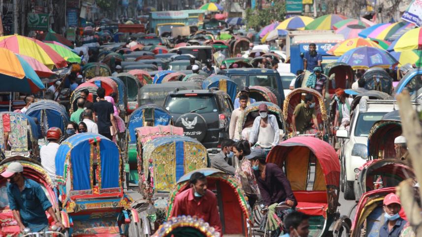 Traffic congestion in front of Dhanmondi Hawkers’ Market during the 'lockdown' on April 25, 2021. Photo: Amran Hossain