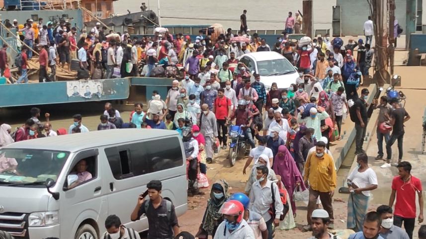 Crowds are forming at Shimulia and Banglabazar ferry ghat as the government has declared a seven-day complete lockdown from Monday.