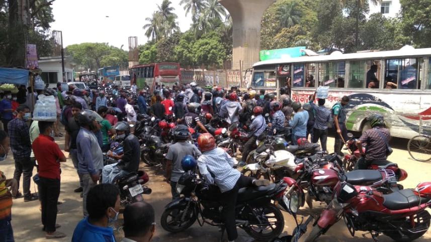 Motorcyclists operating their vehicles under ride-sharing services blocked a road near Dhaka Metropolitan Police Headquarters today, demanding that the government allow them to continue their services during the weeklong restriction on public movement and transports.