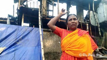 Nazma Begum Shopna was weeping outside the Sattola slum and trying to go to her shanty for her belongings -- all burnt in the fire at Dhaka’s Mohakhali this morning.