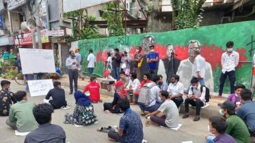 Students of Rajshahi today demonstrated -- holding symbolic class on a road in the city’s Shaheb Bazar area -- demanding immediate reopening of all educational institutions.