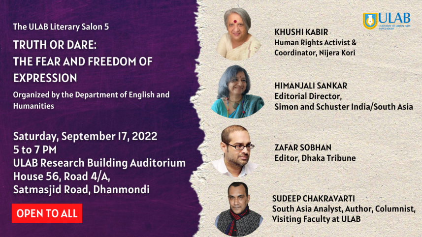 After hosting in August a session on the Partition and its effects with Professors Niaz Zaman and Sayeed Ferdous in Dhaka, Prof. Rituparna Roy, founder-trustee of Kolkata Partition Museum, and Aanchal Malhotra, a New Delhi-based writer who has written two engaging books related to the western Partition, the ULAB Literary Salon will showcase a discussion on one of the most pressing issues of our time: freedom of expression. The event will take place at 5 PM today, September 17, at the ULAB Research Building Auditorium on Satmasjid Road, Dhanmondi.