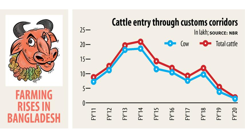 Data from the National Board of Revenue (NBR) showed that the number of cattle brought over informally over the borders was 21 lakh in fiscal 2013-14.