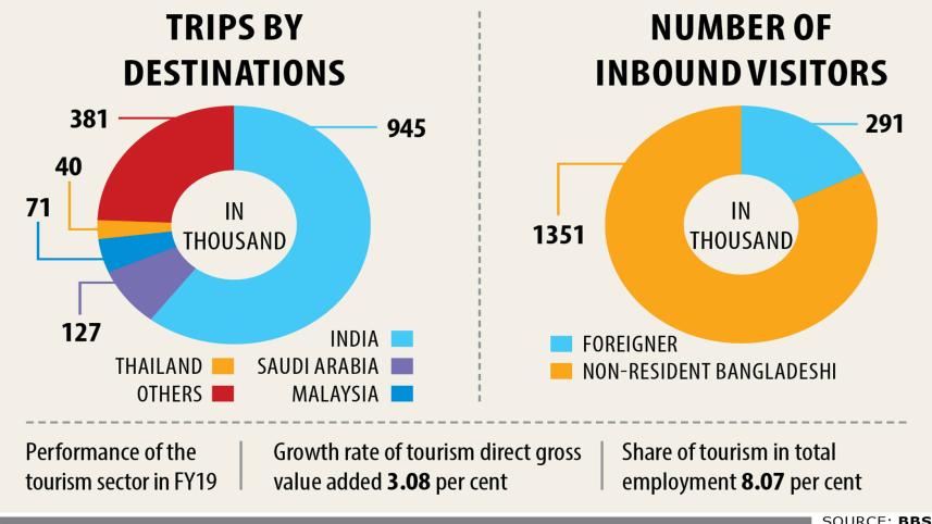 For outbound tourism, the expenditure appeared to be Tk 33,686.8 crore, of which Tk 7,494.3 crore (22.25 per cent) was pre-trip expenditure (domestic expenditure for outbound trip).
