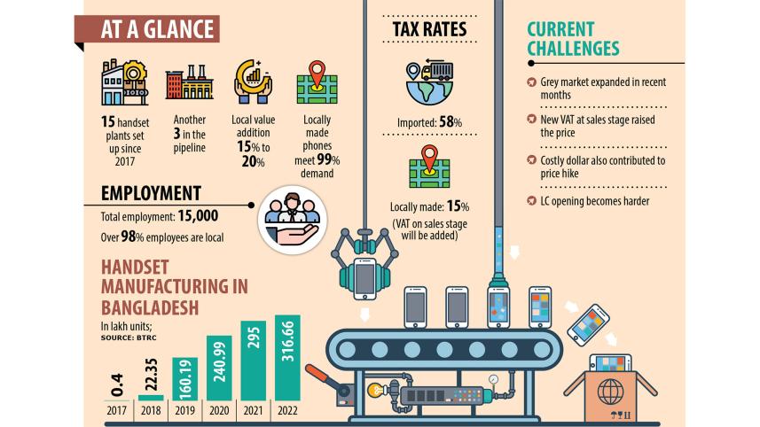 A total of 15 plants have so far been established in Bangladesh, producing 10.35 crore handsets as of 2022, according to Bangladesh Telecommunication Regulatory Commission (BTRC), which provides manufacturing permits.
