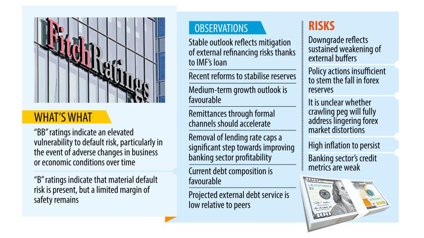 Fitch Ratings yesterday downgraded Bangladesh's long-term foreign-currency issuer default rating to "B+" from "BB-" owing to the lingering weakening of the country's external buffers.