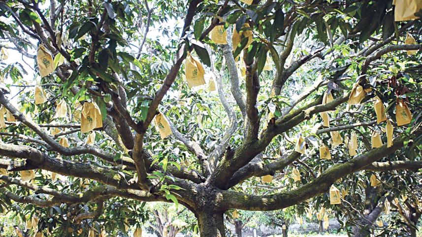 In the Jinnahnagar area of Rajshahi city, this correspondent saw brown fruit bags were covering mangos in an orchard owned by Anwarul Hoque, president of the Rajshahi Safe Agro Food Producers' Society.