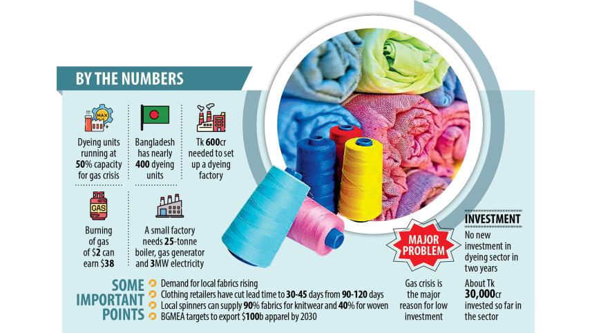 Investment has dried up in Bangladesh's dyeing sector, a vital cog in the textile and apparel supply chain, owing to the dragging gas shortage despite higher demand for fabrics from local garment exporters, industry people say.
