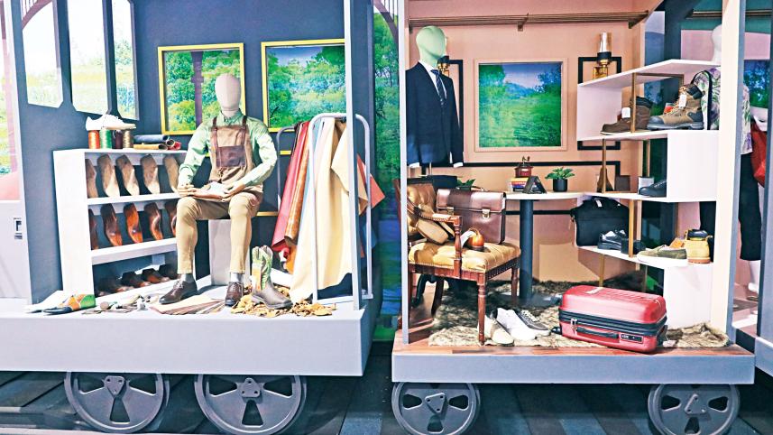 At a stall of Bangladesh Tanners Association, several companies are displaying leather-made footwears, bags and accessories.