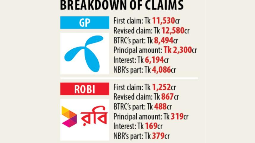 According to the Bangladesh Telecommunication Regulatory Commission's audits into the two operators' books from their inception until December 2014, Grameenphone has Tk 12,579.95 crore pending and Robi Tk 867.24 crore.